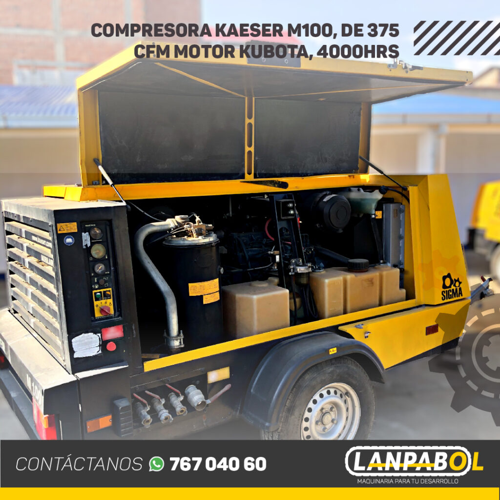 COMPRESORA KAESER M100 COMPRESORA KAESER M100 TIPO: COMPRESORAMARCA: KAESERMODELO: M100SUB MODELO: COMPRESOR PORTATIL, MOTOR A DIESELDESCRIPCIÓN: 375 CFM (PIES CÚBICOS), MOTOR KUBOTAAÑO: 2017CONDICIÓN: SEMI NUEVOHORAS O KM DE USO: 4000 HRSUBICACIÓN: LANPABOL 25.000 US$ + IVA cotizar